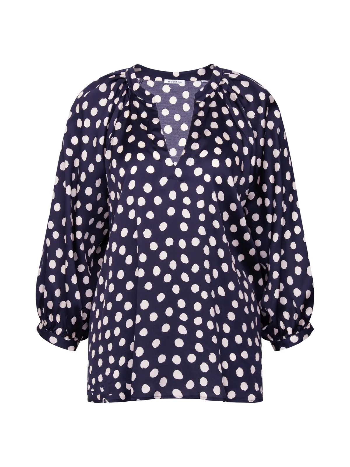 Blouse type: Klassieke blouse; Design: Pofmouwen; Materiaal: Satijn; Motief: Gestippeld; Kraag: Tuniek kraag; Details: Gedrapeerd; Extra's: All-over patroon; Pasvorm: Losse pasvorm; Armlengte: Lange mouw; Lengte: Lange pasvorm
