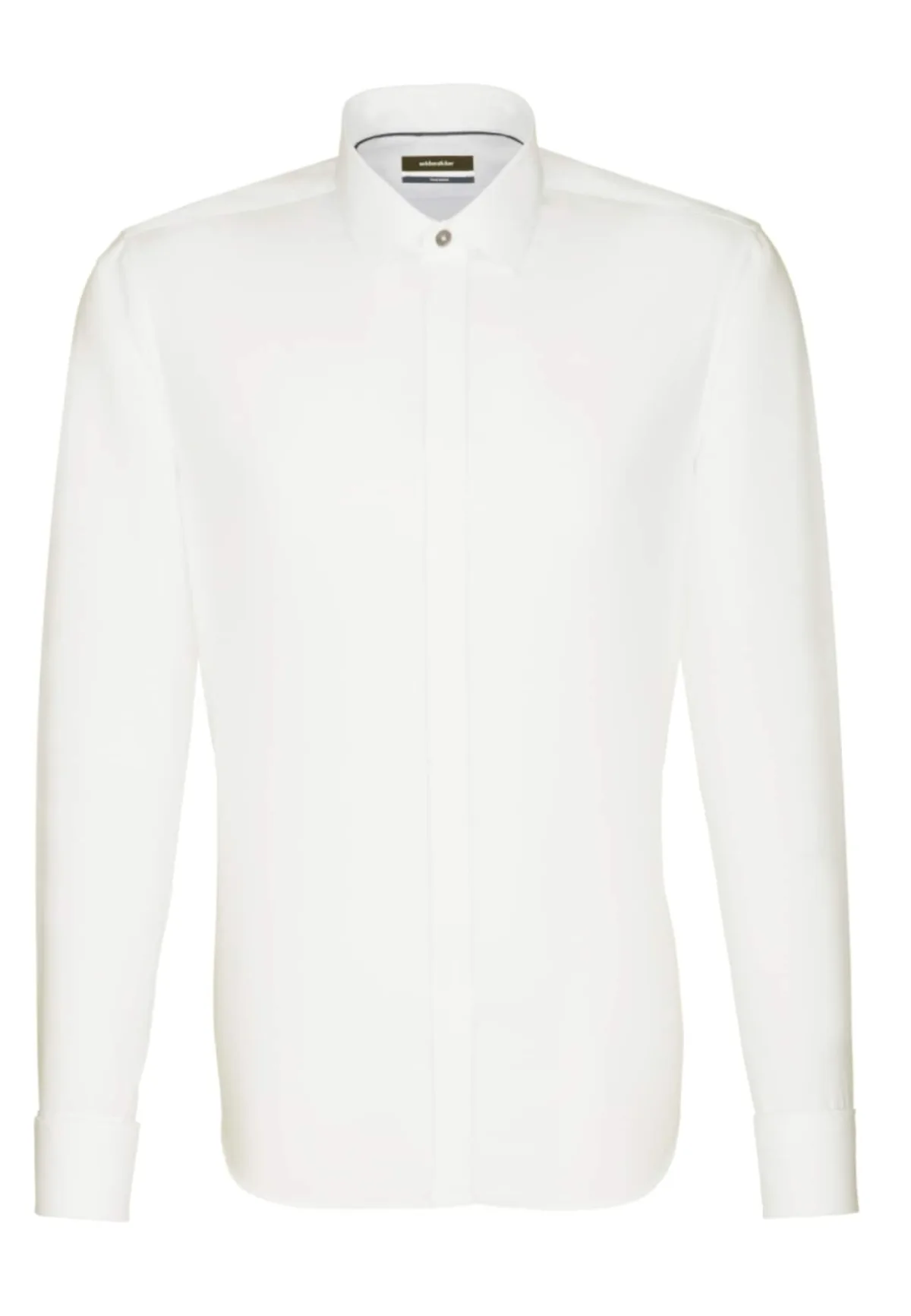 Design: 1-knoops manchetten, Ronde zoom, Verborgen knop placket; Type sluiting: Knoopsluiting; Materiaal: Katoen; Motief: Effen; Kraag: Kentkraag; Extra's: Op staal naden, Voelt zacht aan; Pasvorm: Slim fit; Armlengte: Lange mouw