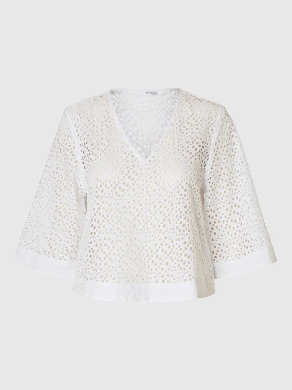 De Blouse Laerke van Selected Femme is een stijlvolle blouse met een button down kraag, gemaakt van katoen. Het heeft een losse pasvorm, brede manchetten, een V-hals en een elegant gaatjespatroon. Perfect voor casual zomerse gelegenheden.