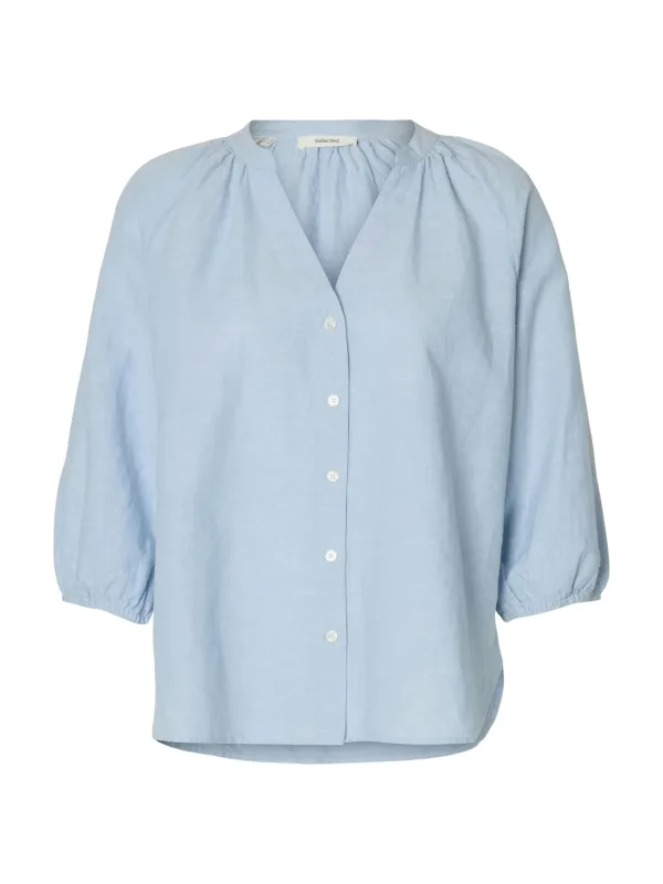 Blouse Cleo-Alberta Linnen Blend van Selected Femme is een casual blouse met V-hals en knoopsluiting. Deze dames blouse heeft een losse pasvorm, 3/4 mouwen met elastische manchetten en een effen patroon. Perfect voor een ontspannen dagje uit.