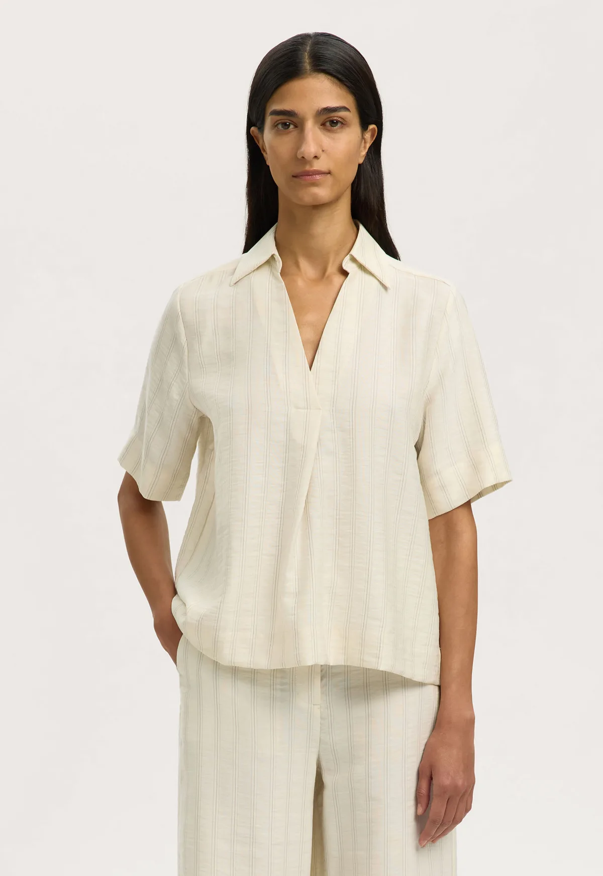 Dit is het 16100348 Marie 2/4 Shirt van het merk Selected Femme. Deze Shirt heeft een regular pasvorm en is vervaardigd uit een mix van lyocell, viscose en gerecycled nylon. De opstaande kraag geeft een elegante touch, terwijl de korte mouwen zorgen voor een luchtige uitstraling.