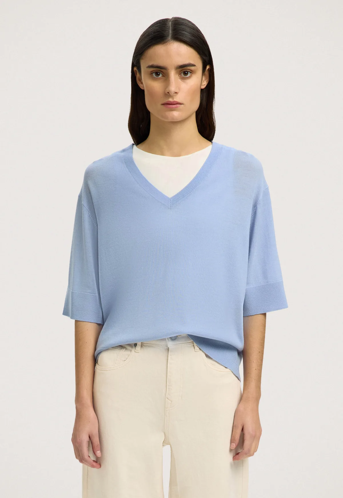 Dit is de 16099685 Merinowol Trui van het merk Selected Femme. Deze trui heeft een regular pasvorm en is gemaakt van 100% merinowol, waardoor hij heerlijk zacht en comfortabel is om te dragen. De V-hals en korte mouwen maken de trui tot een veelzijdig item dat zowel solo als in combinatie met andere lagen gedragen kan worden. De geribde boorden geven een subtiele afwerking die de elegante uitstraling van de trui versterkt.