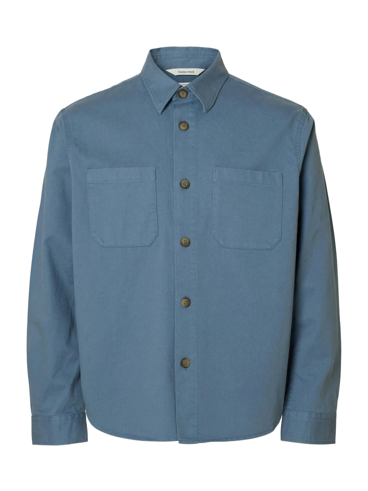 Overhemdjack van SELECTED HOMME voor heren;Model 'Travis';Look: effen;Pasvorm: Regular fit ;Kraagmodel: Platte kraag;Sluiting: enkele knoopsluiting;Mouwvorm: lange mouwen;Mouwboord: Manchet;Zakken: Borstzakken;Materiaalverwerking: Twill;Materiaal: Mix van biologisch katoen
