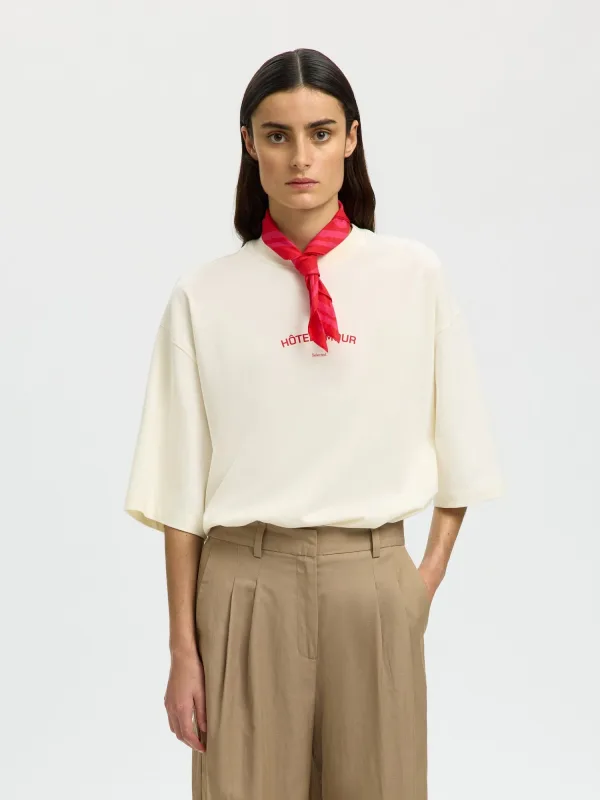 Voor een ontspannen, maar doordachte look is dit SELECTED FEMME katoenen T-shirt met backprint voor dames een praktische basis in je garderobe. De ecru kleur oogt zacht en rustig, terwijl de tekstprint op de achterkant zorgt voor een verrassend detail. De boxy pasvorm valt iets ruimer, wat het shirt een moderne uitstraling geeft en prettig draagt in het dagelijks leven.Eenvoudige basis met grafische achterkant Gemaakt van 100% katoen, voelt zacht en soepel aan op de huid Ecru kleur, makkelijk te combineren met denim, shorts of een nette broek Korte, rechte mouwen en ronde hals voor een rustige uitstraling Backprint met tekst voor een grafisch accent aan de achterkant Valt normaal volgens het maatadvies, kies je gebruikelijke maat Praktische verzorging: wasbaar op 40 graden, warm strijkbaar en drogen op lage temperatuurStyling voor elke dagDit T-shirt past goed in een casual outfit met een straight jeans en sneakers, maar combineert ook goed met een nette pantalon met loafers. Door de rustige voorkant blijft je look clean, terwijl de backprint zichtbaar wordt zodra je je omdraait of je jas uitdoet.De stijl van SELECTED FEMMESELECTED FEMME biedt moderne collecties met een rustige, Scandinavische signatuur. De ontwerpen hebben aandacht voor details, draagbaarheid en vorm. Dit T-shirt sluit daarop aan als basisstuk voor alledaagse outfits.Een shirt dat je gemakkelijk het hele seizoen door draagt.
