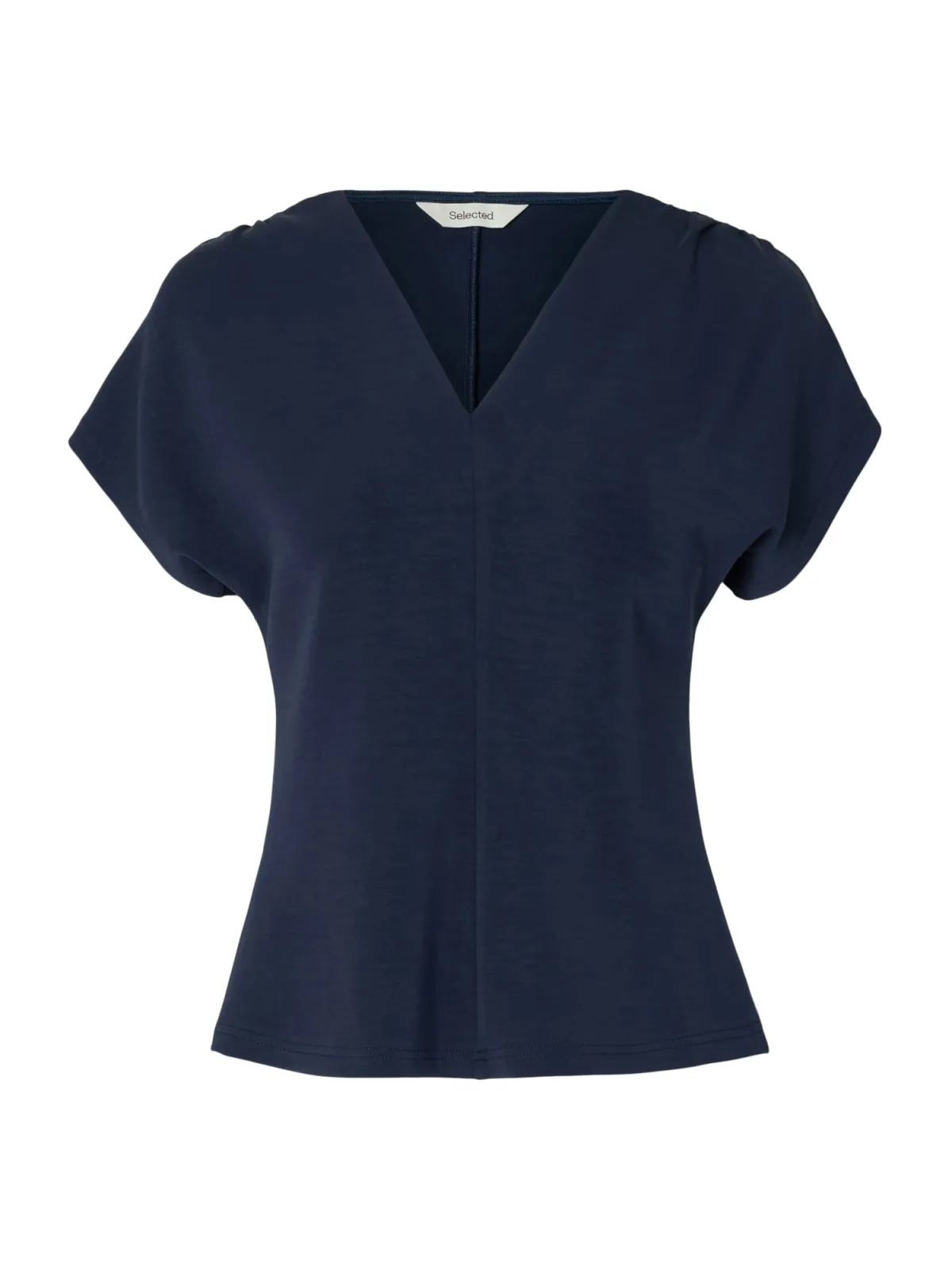 Deze donkerblauwe V-hals top voor dames van SELECTED FEMME is een praktische basic voor elke dag, met een verzorgde uitstraling. De top heeft een subtiel getailleerde pasvorm die je figuur zacht volgt, zonder strak te zitten. De kapmouwtjes vallen netjes over je schouders en de V-hals geeft je look een open halslijn. De soepele stof met elastaan rekt licht mee en voelt zacht aan op de huid, geschikt voor lange werkdagen of een etentje na kantoor.Details die het verschil maken Effen donkerblauwe kleur, makkelijk te combineren met jeans, pantalon of rok Getailleerde pasvorm voor een mooie lijn Kapmouwen met een zachte schouderlijn V-hals die rustig rondom de hals valt Zachte, soepele kwaliteit met lichte stretch voor extra draaggemak Valt normaal volgens het maatadvies Wasbaar op 30 graden en lauw strijkbaar (1 punt) Niet drogen in de droogtrommel, zodat de vorm mooi behouden blijftVeelzijdig voor werk en vrije tijdDeze top past goed in een zakelijke garderobe met een blazer en nette broek, maar ook in een meer casual look met een los vest en sneakers. Door de effen kleur en de rustige belijning is dit een item dat je eenvoudig combineert.SELECTED FEMME: moderne klassiekersSELECTED FEMME staat voor moderne kleding met een stijlvolle, heldere lijn. De ontwerpen zijn doordacht, met aandacht voor pasvorm en draaggemak. Zo stel je eenvoudig een garderobe samen die lang meegaat en geschikt is voor dagelijks gebruik.Een basis top die je het hele seizoen vaak kunt dragen.