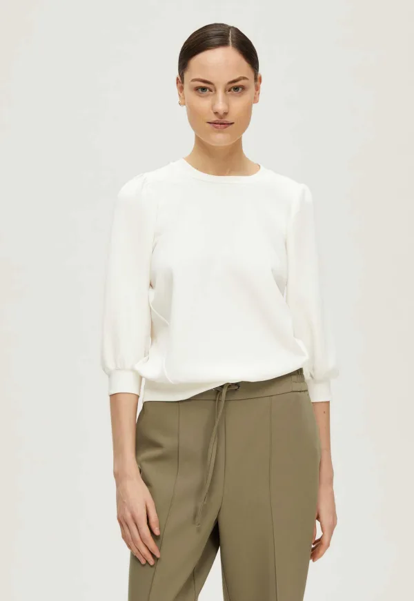Dit is de 16082379 Tenny 3/4 Sweater van het merk Selected Femme. De sweater heeft pofmouwen, nauwsluitende mouwuiteinden, nauwsluitende zoomlijn en stiksels aan de voorkant.