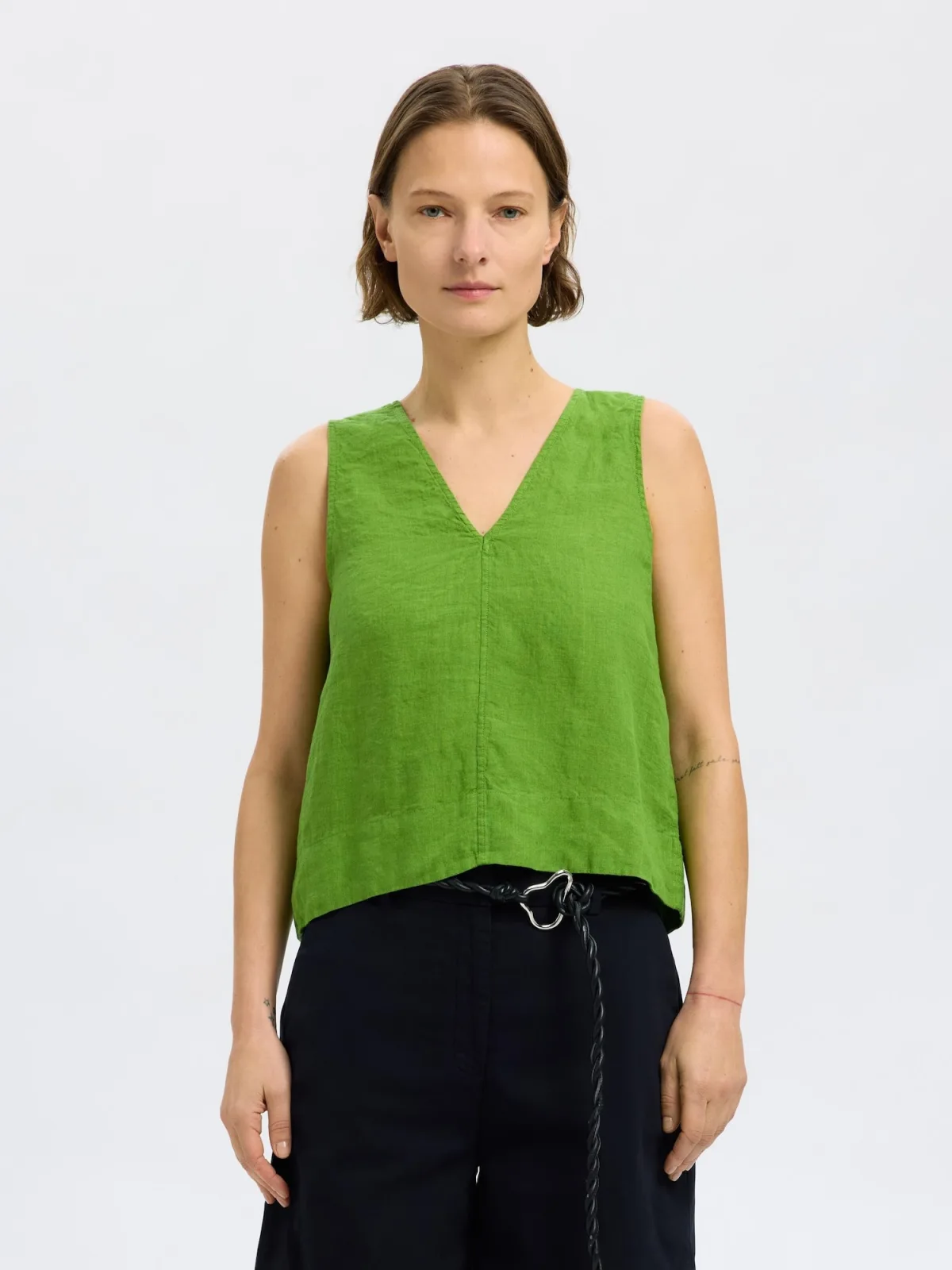 Design: Rechte zoom; Materiaal: Linnen; Halstype: V-hals; Motief: Effen; Soort bandjes: Brede bandjes; Extra's: Op staal naden, Voelt zacht aan, Draaifunctie; Pasvorm: Normale pasvorm; Armlengte: Mouwloos; Lengte: Normale lengte