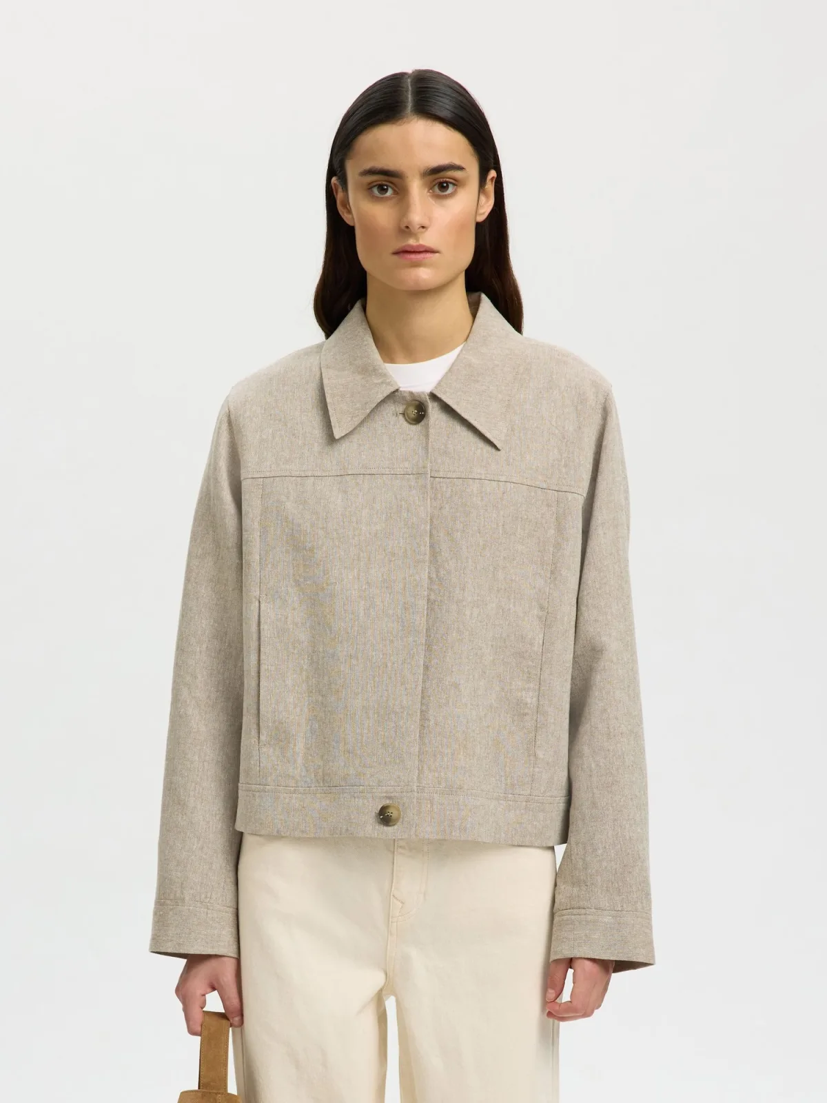 Design: Gevoerde zoom/rand; Type sluiting: Knoopsluiting; Type jas: Blouson; Voering: Niet gevoerd; Materiaal: Linnen; Motief: Mélange; Extra's: All-over patroon, Label patch/label flag; Pasvorm: Normale pasvorm
