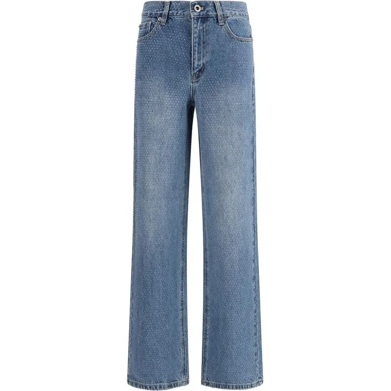 De rechte jeans van Self Portrait zijn gemaakt van blauwe katoen denim en versierd met overal verspreide strassstenen, wat een sprankelend tintje toevoegt aan een schoon, essentieel ontwerp. De rechte pasvorm zorgt voor een veelzijdige uitstraling, afgewerkt met riemlussen, vijf klassieke zakken en een sluiting aan de voorkant met een metalen knoop en rits. Een stuk dat glamoureuze aantrekkingskracht mengt met dagelijkse functionaliteit. Seizoen: SS26 Pasvorm: Regular Samenstelling: 100% Katoen
