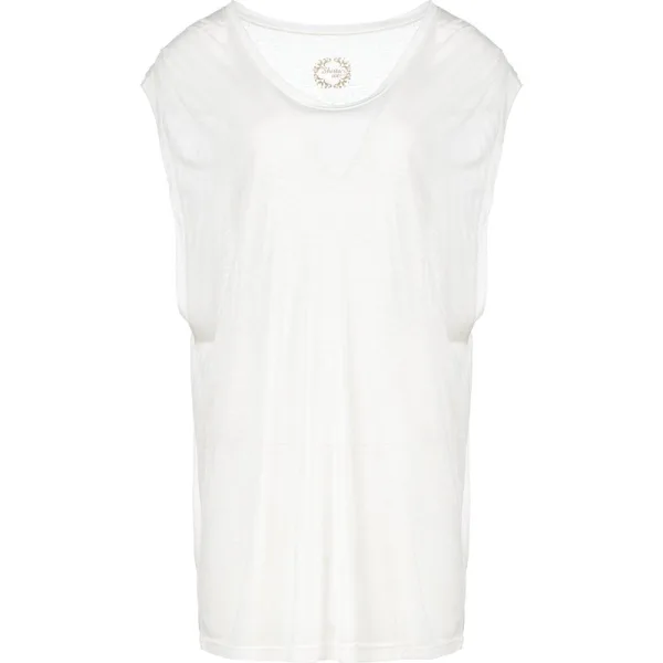 Deze half doorzichtige top is gemaakt van ultralichte organische linnen-viscose stof. Het is mouwloos met brede armsgaten, dus ideaal om te dragen met een topje of bandeau eronder. Het heeft een brede boothals. De top heeft een ontspannen los oversized silhouet.