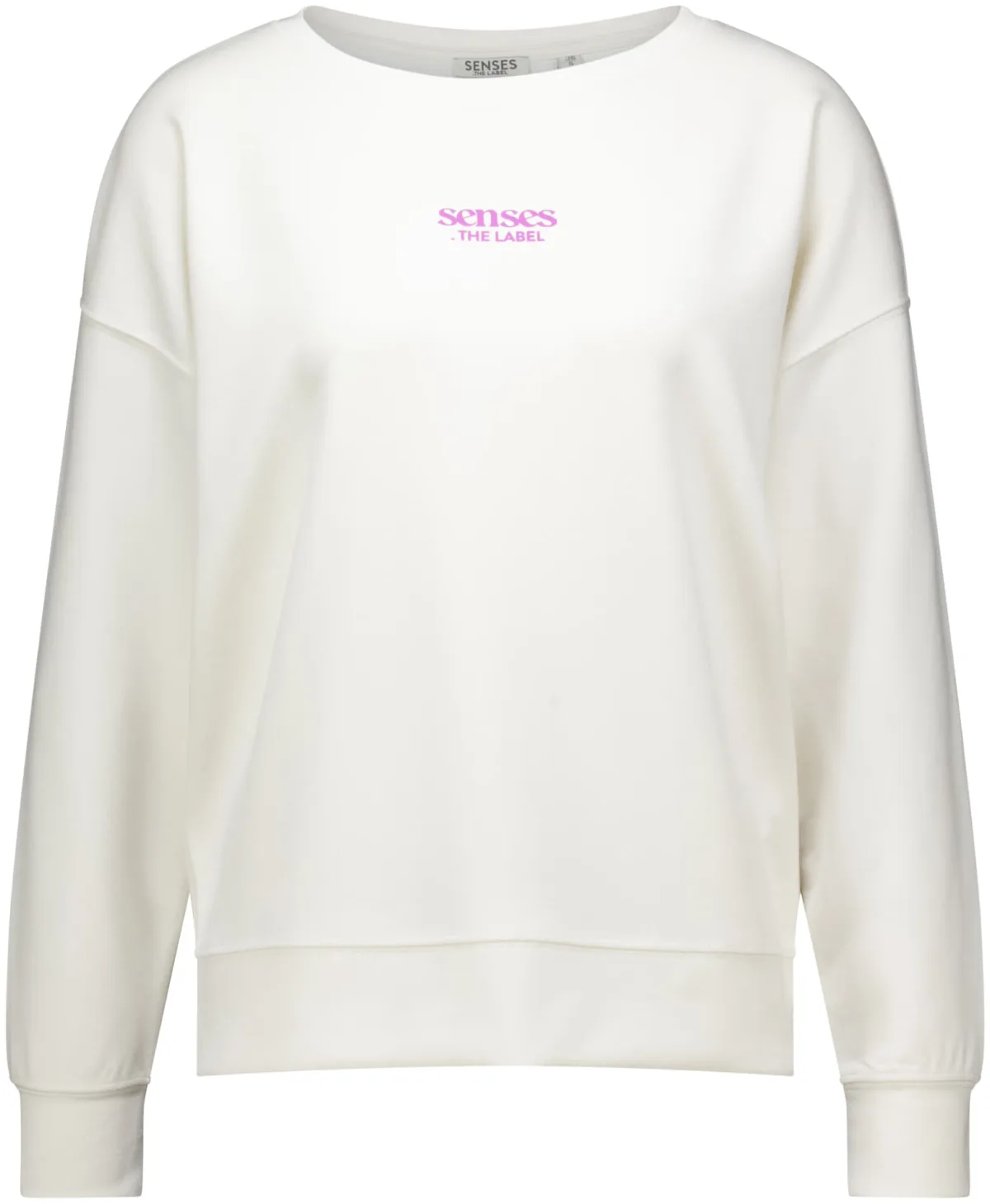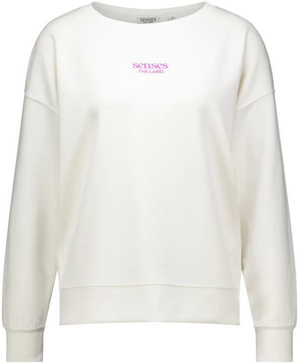 Sweatshirt top lange mouw van Senses The Label met ronde hals, lange mouwen met ribgebreide boorden en een oversized pasvorm. De effen, crèmekleurige uitvoering krijgt een minimalistische touch door het subtiele logodetail op de borst, ideaal voor casual combinaties.
