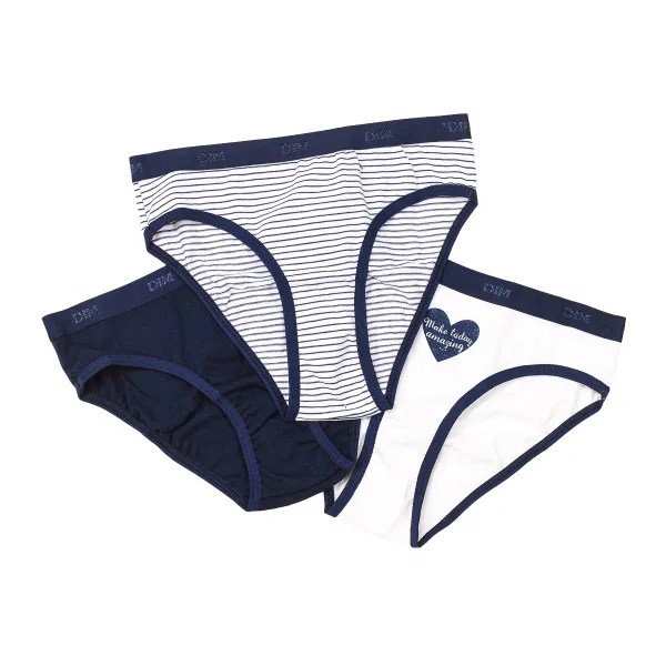 Set van 3 meisjesslips. Kleur marine-strepen-wit Rubberen tailleband, met de geborduurde merknaam. Ademende stof. Naden in toon zichtbaar. Samenstelling: 95% Katoen, 5% Elastaan Onderhoud: - Wassen op max. temperatuur. 40º. - Geen bleekmiddel gebruiken. - Niet in de droger. - Niet strijken. - Niet chemisch reinigen. Samenstelling: 95% Katoen, 5% Elastaan Onderhoud: Onderhoud: - Wassen op max. temperatuur. 40º. - Geen bleekmiddel gebruiken. - Niet in de droger. - Niet strijken. - Niet chemisch reinigen.
