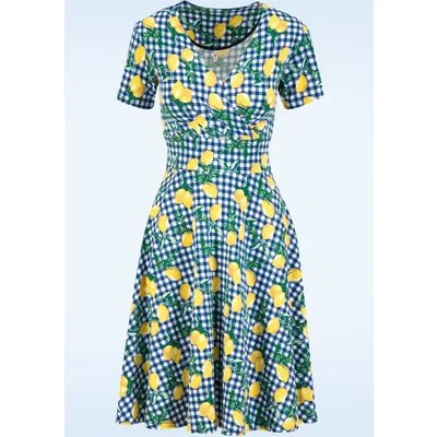 “When life gives you lemons, wear them beautifully.” Deze comfortabele jurk heeft een elegante V-halslijn met vaste overslag en flatterende plooitjes. De subtiele tailleband accentueert je figuur op natuurlijke wijze, terwijl de knielange, zwierige rok sierlijk met je meebeweegt. Gemaakt van een zachte, stretchy biologische katoenmix met een blauw-witte ginghamruit en speelse citroentjes. * Swing model * Vaste geplooide overslag * Geen rits of knopen; aantrekken en ready to go! * Valt net over de knie bij een lengte van 1,70 m