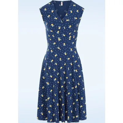 “Bring the zest. Leave the rest.” Deze mouwloze beauty heeft een elegante V-halslijn met vaste overslag en flatterende plooitjes. De subtiele tailleband accentueert je figuur op een natuurlijke manier, terwijl de knielange, zwierige rok prachtig met je meebeweegt. Ze is uitgevoerd in een supercomfortabele, stretchy donkerblauwe bio-katoenmix met witte pindots en citroenen! * Swing model * Mouwloos * Vaste geplooide overslag * Geen rits of knopen; aantrekken en ready to go! * Valt net over de knie bij een lengte van 1,70 m