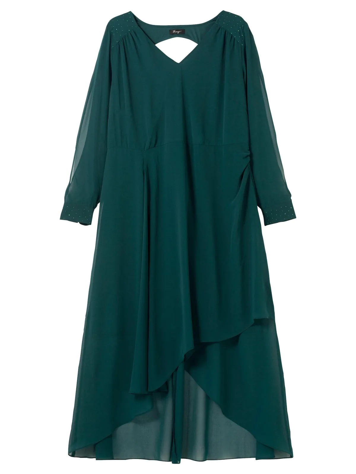 Design: Verlengd rugpand; Type sluiting: Ritssluiting; Materiaal: Chiffon; Halstype: V-hals; Motief: Effen; Details: Cut-outs, Sierstenen, Gedrapeerd, Wikkel design; Extra's: Lichte stof; Lengte: Knielengte; Snit: Uitlopend; Pasvorm: Normale pasvorm; Armlengte: Lange mouw