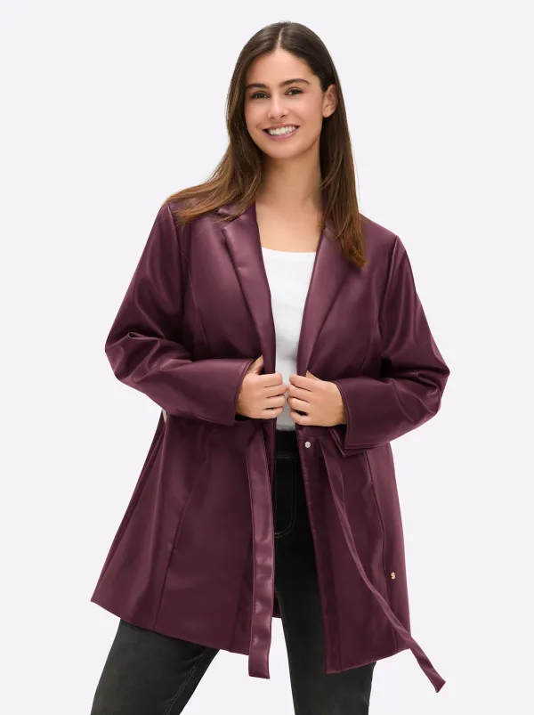Design: Revers kraag, Zijdelingse inkepingen, Om te knopen/binden, Zakken aan de zijkant; Voering: Licht gevoerd; Materiaal: Imitatieleder; Motief: Effen; Extra's: Op staal naden; Pasvorm: Normale pasvorm