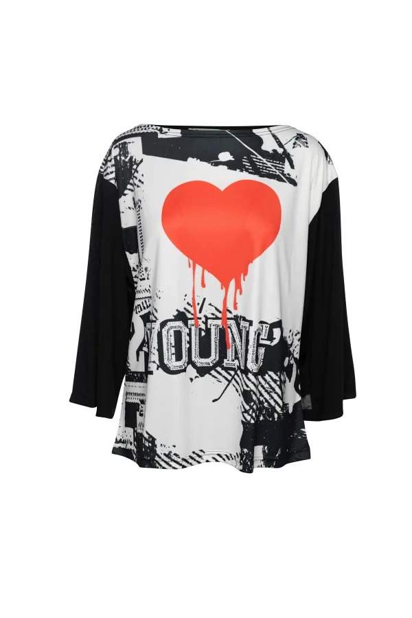 Deze slanke top met opvallende print doet denken aan het Oosten en zal zeker opvallen. Gemaakt van heerlijk zachte glanzende stof, is de voorkant voorzien van het 2-Young logo in een kunstig grafisch ontwerp. Een transparante achterkant verhoogt de sensuality factor en creëert een verwoestende begeerlijke combinatie. Boot halslijn. Wijde 3/4 mouwen.