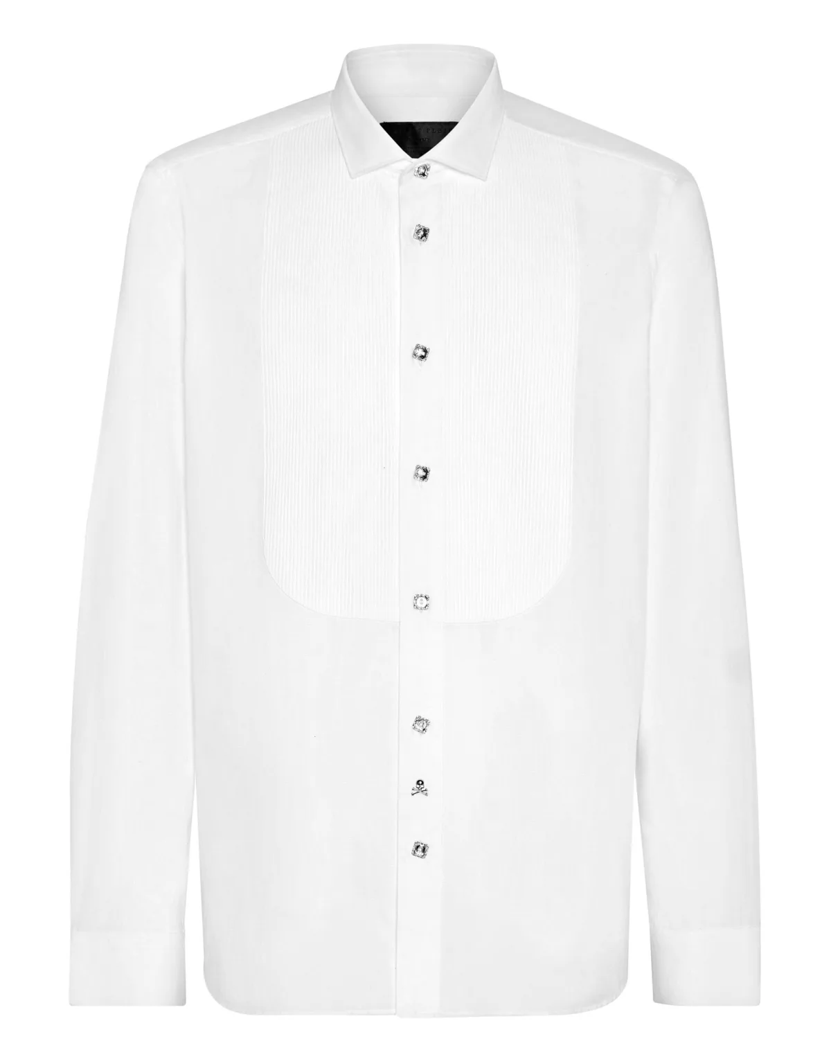 Verander je elegantie voor speciale gelegenheden met dit katoenen avondhemd van briljantine. Zie onze zorg voor details in de kleine bladkraag, de geplooide slab en de Swarovski-knopen. Afgeronde onderkant. Plooien aan de achterkant.