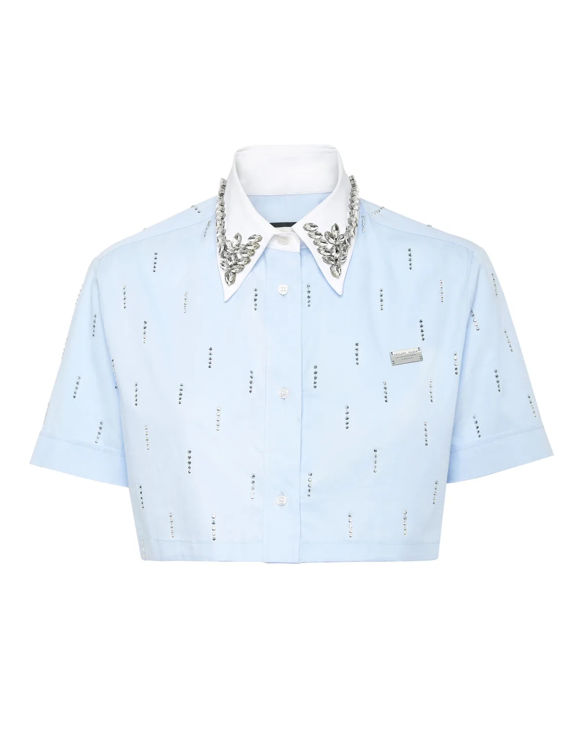 Verfraaid Add a whiff of uniqueness to your look with this cotton poplin short sleeve, crop shirt and... Find out what makes it one of a kind. Cotton poplin Rhinestone décors on collar Rhinestone appliqués Logoed buttons Fit: Cropped