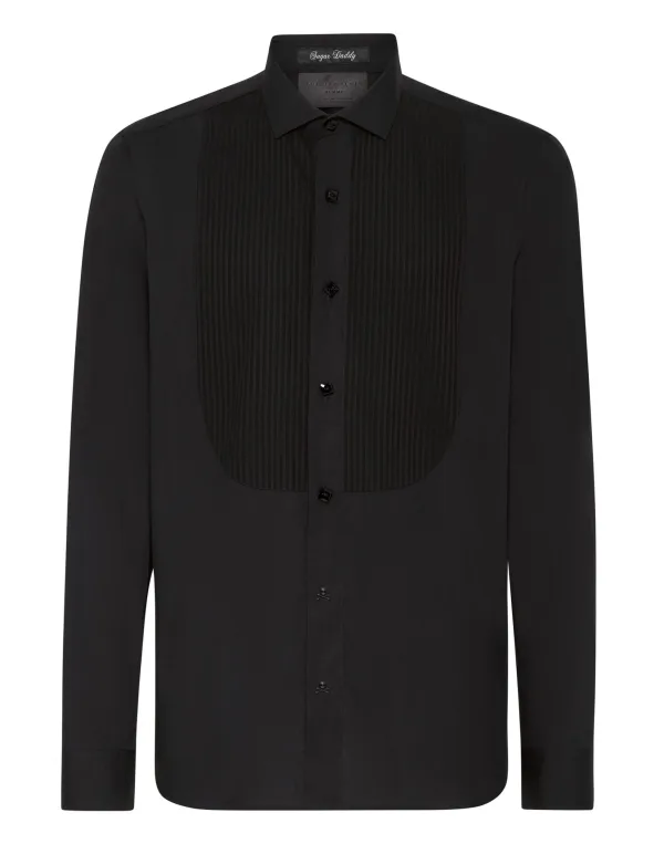 Verander je elegantie voor speciale gelegenheden met dit katoenen avondhemd van briljantine. Zie onze zorg voor details in de kleine bladkraag, de geplooide slab en de Swarovski-knopen. Afgeronde onderkant. Plooien aan de achterkant.