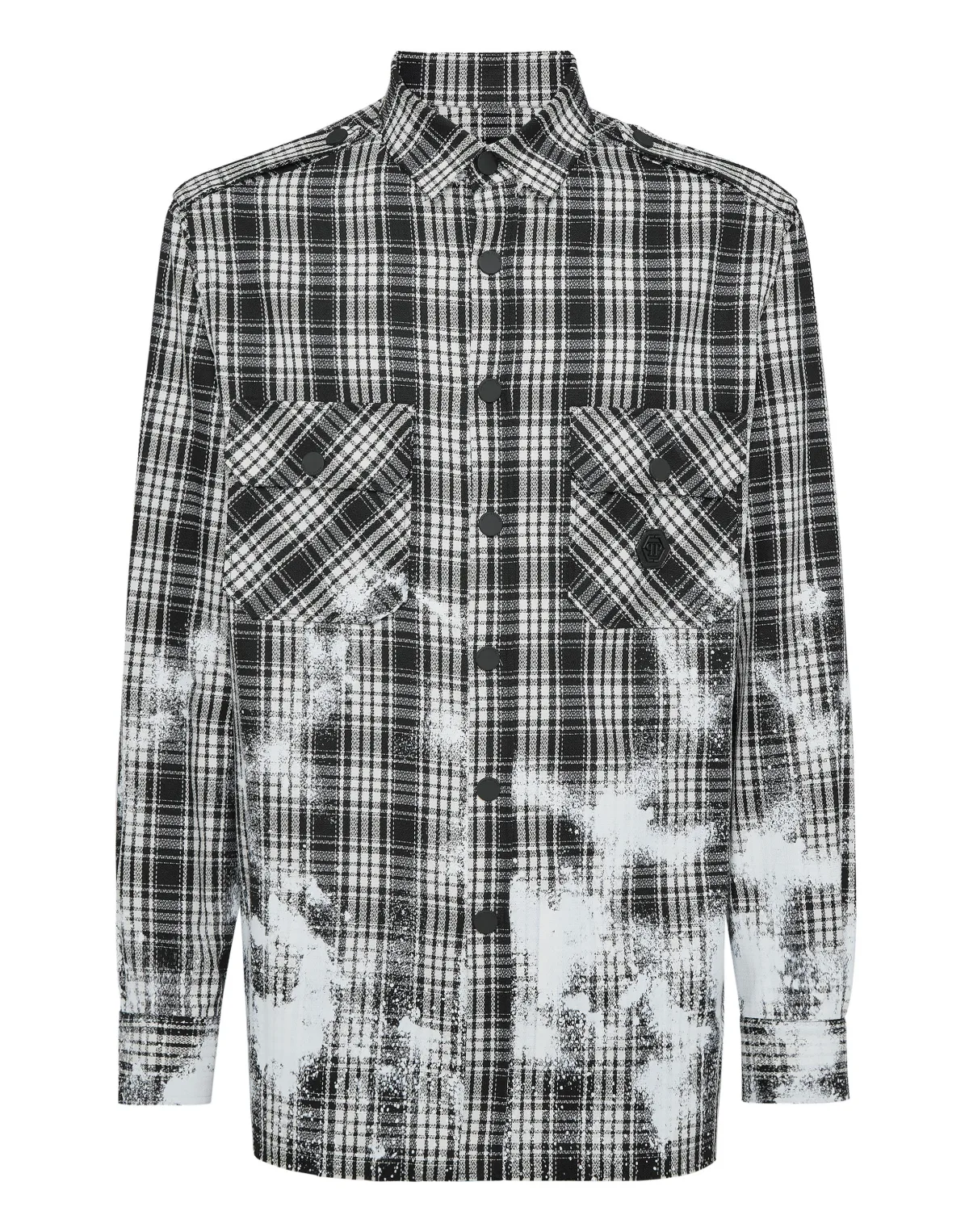 Add a whiff of uniqueness to your look with this cotton flannel shirt. Find out what makes it one of a kind. Yarn-dyed tartan cotton flannel Rhinestones at back Spary print Two patch pockets with flaps Epaulettes sewn at shoulder Snap buttons Curved hem with raw-cut edge Fit: Sugar Daddy