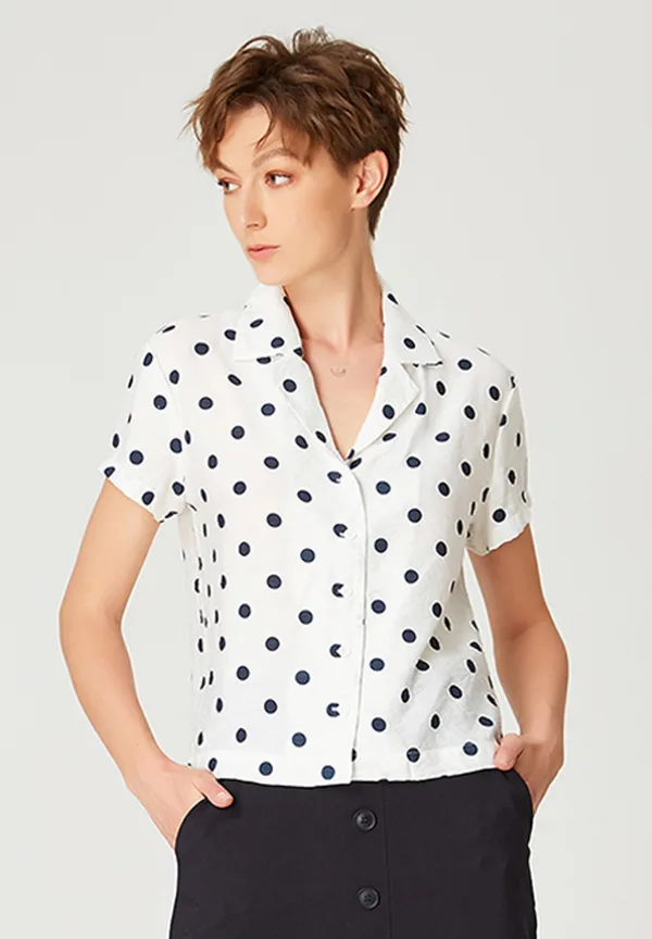 Een eenvoudige en comfortabele pasvorm, dit shirt is een veelzijdig stuk om te combineren met rokken en blazers voor het kantoor of om over jeans te dragen voor informele dagen. Met een polka dot print voor een enigszins retro -look. Productdetails • Vorm: recht • Korte mouwen • Italiaanse shirt kraag • Midden voorgeknoopt • Lengte: 55 cm