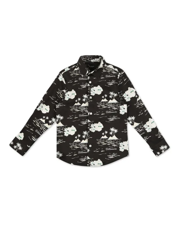 A Hawaiian style print decorates throughout this cotton poplin shirt. Straight point collar and mother-of-pearl button fastening.