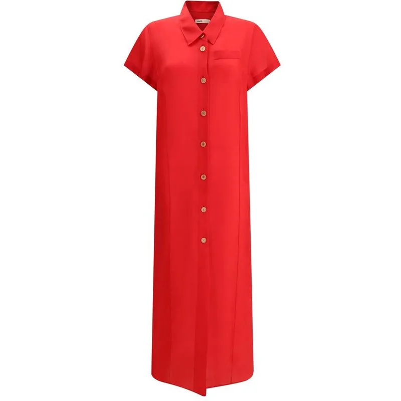 Stap naar buiten,_val op en blijf stijlvol in deze relaxed fit shirtjurk. Ervaar moeiteloze elegantie met zijn vloeiende drapering en levendige rode tint. De klassieke kraag en korte mouwen bieden een tijdloze uitstraling, terwijl de midi-lengte zorgt voor veelzijdige styling voor elke gelegenheid. Geniet van de onderhoudsvriendelijke constructie, waardoor het een duurzame en laagonderhoudse aanvulling op je garderobe is. Perfect voor lunchafspraken of avondevenementen, integreert deze jurk naadloos in je levensstijl en biedt het comfort en verfijning in gelijke mate. Een echte basisgarderobe.
