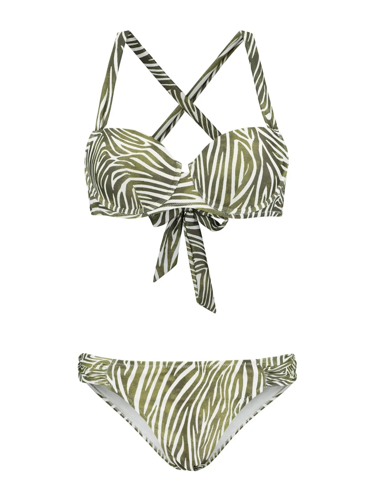 Cup soorten: Soft cup bh; Soort bandjes: Sportrug/kruisende bandjes; Bh/bikini type: Balconette; Beugel: Met beugel; Motief: Dierenprint; Broekvorm: Regular fit; Details: Gedrapeerd; Extra's: All-over patroon, Gladde stof, Huidvriendelijk materiaal