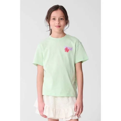 Fris, speels en makkelijk te combineren, dit lichtgroen meisjes T-shirt van katoen is een fijne basic voor elke dag. De zachte kleur lichtgroen past goed bij zowel jeans als een korte broek of rok. Gemaakt van 100% katoen voelt het T-shirt comfortabel aan op de huid, ook tijdens drukke schooldagen of een middag buiten spelen.Praktische details voor elke dag Gemaakt van 100% katoen voor een zachte, ademende feel Low-stretch materiaal geeft vormvastheid en een nette look Ronde hals en korte, rechte mouwen voor een tijdloos model Middellange lengte, makkelijk in of over een broek te dragen Lichtgroene kleur met logo print voor een subtiele, trendy uitstraling Geschikt voor peuter, kleuter, schoolkind en tiener Wasbaar op 30 graden, handig in het dagelijkse wasritmeStoer en speels combinerenDit lichtgroene T-shirt past eenvoudig in de kast van je kind. Draag het op een stoere jeans voor school of met een luchtige short op warme dagen. De middellange lengte maakt het ook geschikt om in een rok te steken, zodat de outfit netjes blijft zitten tijdens bewegen en spelen.Shoeby voor kinderkleding met stijlShoeby staat bekend om eigentijdse collecties voor kinderen, met mode die aansluit op de laatste trends en tegelijkertijd draagbaar blijft voor elke dag. Met dit T-shirt kies je voor een stijlvol basisitem dat past binnen een moderne kindergarderobe.Een veelzijdig T-shirt dat snel een favoriet wordt in de dagelijkse outfits.