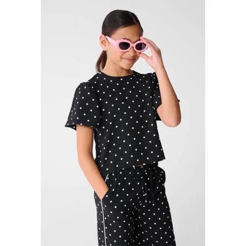 De Twist polkadot top zwart van Shoeby is een speelse blousetop voor meisjes. De zwarte basis met witte stippen geeft een frisse uitstraling, terwijl de regular fit zorgt voor een comfortabele pasvorm. De top heeft korte pofmouwen en een ronde hals, wat het model een moderne en toch lieve look geeft.Details die het verschil maken Blousetop met regular fit voor een comfortabele pasvorm Korte pofmouwen voor een speelse, trendy look Ronde hals die mooi aansluit bij verschillende gezichtsvormen Knoopsluiting op de rug als stijlvol en praktisch detail Zwart met all-over stippenprint, makkelijk te combineren Middel lengte, valt mooi op een broek of rok Non-stretch stof met een soepele touch Onderdeel van een co-ord set, leuk te dragen als complete look Geschikt voor peuter, kleuter, schoolkind en tiener Wasbaar op 30 graden, praktisch in het dagelijks gebruikGemakkelijk stylen voor elke dagDeze stippen top kan prima met een jeans voor school, maar past ook goed bij een nette broek of rok voor een feestje. De middel lengte maakt dat de top mooi in of over de broek te dragen is, afhankelijk van de wens en gelegenheid.Shoeby: eigentijdse stijlen voor kidsShoeby staat bekend om toegankelijke mode met een modieuze twist voor het hele gezin. De collecties voor kinderen zijn afgestemd op een actief leven, met aandacht voor pasvorm en draagbaarheid. Zo combineert Shoeby actuele trends met praktische details die handig zijn in het dagelijks leven.Een vrolijke stippen top die gemakkelijk te combineren is met verschillende outfits.