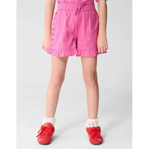Voor vrolijke zomerdagen is deze Shoeby korte broek voor meisjes een praktische basic in de kledingkast. De short heeft een zachte roze kleur met subtiele hartjesprint, die direct zorgt voor een speelse look. Dankzij de hoge taille en elastische tailleband sluit de broek comfortabel aan rond het middel en blijft alles goed op zijn plek tijdens spelen, rennen en fietsen.Speelse details en comfortabel model Gemaakt van 100% katoen, voelt luchtig en zacht aan op de huid High waist model dat mooi aansluit in de taille Elastische tailleband voor snel en makkelijk aan- en uittrekken Low-stretch kwaliteit met een stabiele pasvorm Contrast bies langs de randen voor een sportieve touch Ruches aan de pijpen zorgen voor een speels effect Effen roze basis met kleine hartjesprint Casual short zonder zakken, ideaal voor dagelijks gebruikIdeaal voor school, thuis en vakantieDeze short past goed bij T-shirts, tops en lichte truien. Combineer met sandalen of sneakers voor een luchtige outfit. Door de soepele katoenen stof is de broek geschikt voor warme dagen, maar ook prettig met een luchtige sweater op koelere avonden.Shoeby voor eigenwijze kidsShoeby staat bekend om betaalbare mode met aandacht voor pasvorm en praktische details. De collecties voor kinderen zijn afgestemd op actief gebruik, met stoffen en modellen die makkelijk te dragen en te combineren zijn. Zo wordt aankleden elke dag simpel en overzichtelijk.Een zomerse short die comfort en speelse details combineert in één dagelijks draagbaar item.