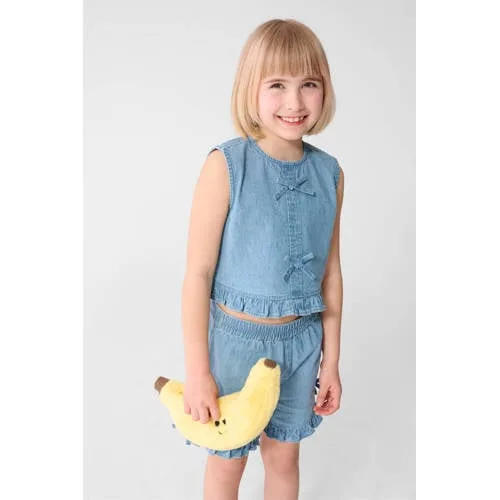 Speels, comfortabel en met een eigentijdse uitstraling, deze blauwe cropped ruffle top voor meisjes is een fijne toevoeging aan de garderobe van je kind. De top heeft een rechtvallende pasvorm, een kortere lengte en is mouwloos, waardoor de top luchtig en makkelijk te dragen is op warmere dagen. De effen blauwe kleur maakt combineren eenvoudig, terwijl de ruches aan de onderkant voor een speels effect zorgen.Details die het verschil maken Mouwloze top, ideaal voor lente en zomer Cropped lengte voor een moderne, trendy look Rechtvallende pasvorm voor comfortabel draaggemak Gemaakt van 100% katoen dat zacht aanvoelt op de huid Effen blauwe kleur, makkelijk te combineren met shorts, rokjes of jeans Ruches aan de onderkant voor een speelse uitstraling Low-stretch stof die de vorm mooi houdt Wasbaar op 30 graden, praktisch voor dagelijks gebruik Geschikt voor peuter, kleuter en schoolkind door de brede maatboogVoor schooldagen en vrije tijdDeze top past goed bij zowel een gewone schooldag als een dagje weg. Door de cropped lengte staat hij leuk op een hoge jeans, een denim short of een zwierig rokje. Omdat het onderdeel kan zijn van een co-ord set, sluit de stijl mooi aan op andere bijpassende items uit dezelfde collectie.Shoeby voor kidsShoeby staat bekend om eigentijdse kinderkleding met aandacht voor pasvorm en draagcomfort. De collecties volgen de laatste trends, maar blijven praktisch voor elke dag. Zo kies je gemakkelijk een outfit waar je kind zich prettig in voelt.Een speelse top die elke outfit net wat meer karakter geeft.