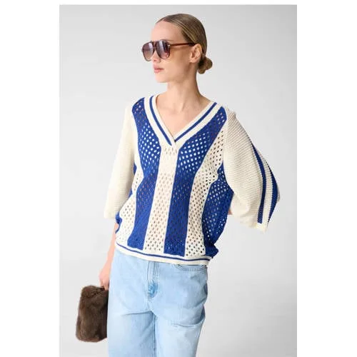 Voor een frisse, dagelijkse look is deze katoenen dames top met driekwart mouw een fijne basis in je kledingkast. De blauw/ecru strepen geven een heldere, tijdloze uitstraling en de V-hals zorgt voor een open, vrouwelijke halslijn. Gemaakt van 100% katoen voelt de stof soepel aan op de huid, fijn voor lange werkdagen of een ontspannen dag thuis.Details die je elke dag draagt Gemaakt van 100% katoen, een ademende en zachte stof voor prettig draagcomfort Low-stretch materiaal, waardoor de top mooi in model blijft Blauw/ecru streepprint voor een rustige, frisse look V-hals die mooi opent bij de hals en goed combineert met een ketting Driekwart rechte mouwen voor een luchtig gevoel en net wat meer bedekking Geen zakken, waardoor het silhouet rustig en strak oogt Wasbaar op 30 graden, handig voor regelmatig gebruik Model is 176 cm lang en draagt maat S, handig als referentie voor de pasvormAlledaags gemak in een gestreepte topDeze top uit de Daily collectie is ideaal voor elke dag. Combineer met een jeans en sneakers voor een casual look, of draag met een pantalon en loafers voor een meer geklede combinatie. De driekwart mouwen maken de top heel geschikt voor het voorjaar of een koele zomerdag.Shoeby als vertrouwde stijlpartnerShoeby richt zich op moderne kleding met een toegankelijke stijl, die past bij een druk en veelzijdig leven. De collecties zijn ontworpen om gemakkelijk te combineren, van werk tot weekend. Met deze top kies je voor een item dat aansluit bij die nuchtere, modieuze benadering.Een gestreepte basic die je moeiteloos vaak uit de kast pakt.