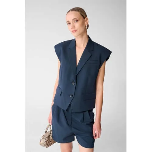 Geef je outfit in één keer een verzorgde upgrade met dit donkerblauw dames gilet van Shoeby. Het mouwloze model heeft een klassieke reverskraag en een effen kleur, waardoor het rustig oogt en makkelijk te combineren is. Door de regular fit valt het gilet comfortabel rond het bovenlichaam en is er ruimte om er een blouse, top of T-shirt onder te dragen. De stevige, low-stretch stof zorgt ervoor dat het silhouet recht blijft en niet uit vorm raakt. In maat S is de totale lengte 52 cm, wat zorgt voor een moderne, middel-lange look.Verzorgde details voor elke dag Regular fit voor een comfortabele, rechtvallende pasvorm Mouwloos ontwerp, ideaal om te layeren over tops en blouses Reverskraag en knoopsluiting voor een nette, moderne uitstraling Stevige low-stretch stof die het model mooi in vorm houdt Sierzakken en subtiele schoudervulling voor een strakker silhouet Donkerblauwe kleur, makkelijk te combineren in je dagelijkse garderobe Onderdeel van een co-ord set of pak, maar ook los goed te dragen Geschikt voor handwas, zodat de vorm en kleur mooi blijvenVan werkdag tot weekendVoor een werkdag combineer je dit gilet met een nette broek of bijpassende pantalon voor een pak-look. In het weekend draag je het wat nonchalanter met een T-shirt en een rechte jeans. De middel-lange lengte maakt het ook geschikt boven een high waist broek of rok.Shoeby: stijl voor elke dagShoeby biedt toegankelijke mode met een eigentijdse twist. De collecties zijn ontworpen om makkelijk te combineren te zijn, zodat je met een paar goede items steeds nieuwe looks kunt maken. Dit gilet sluit hier goed op aan en vormt een praktische basis in je dagelijkse garderobe.Een item waarmee je het hele seizoen door eenvoudig een verzorgde look neerzet.