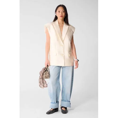 Geef je look direct meer power met dit oversized mouwloos gilet in ecru. De mouwloze blazer heeft een ontspannen, oversized pasvorm met een lage schouderlijn en vaste schoudervullingen, waardoor een strak en gestructureerd silhouet ontstaat. De licht glanzende, stevige stof valt mooi recht langs je lichaam en blijft goed in vorm, ook doordat het materiaal low-stretch is. De gebroken witte kleur en de reverskraag geven een heldere, moderne uitstraling die zowel bij een jeans als bij een nette pantalon past. Bij maat XS/S is de totale lengte 73 cm, het model op de foto is 176 cm lang en draagt maat XS/S.Belangrijkste details van dit gilet Oversized fit met lage schouderlijn voor een relaxed maar krachtig silhouet Vaste schoudervullingen voor extra structuur in de schouders Licht glanzende stof voor een verzorgde, geklede uitstraling Reverskraag en knoopsluiting voor de look van een blazer Mouwloos ontwerp, ideaal om te layeren over tops, blouses of jurken Sierzakken aan de voorkant voor een nette, afgewerkte look Low-stretch kwaliteit waardoor het model mooi in vorm blijft Wasvoorschrift: niet wassen Te dragen als co-ord set of pak met bijpassende itemsVan dagelijkse look tot feestelijke outfitDit ecru gilet uit de Daily collectie is geschikt voor verschillende gelegenheden. Combineer het casual met een T-shirt en een rechte jeans, of maak het feestelijk met een strakke top, een bijpassende broek en hakken. Door de middel-lange lengte valt het mooi over de heupen en sluit het goed aan op zowel hoge als middelhoge tailles.Sfeer en stijl van ShoebyShoeby staat bekend om eigentijdse collecties die inspelen op trends en tegelijk goed draagbaar blijven voor elke dag. Met aandacht voor pasvorm, details en combinatiemogelijkheden biedt Shoeby items die je makkelijk met elkaar mixt tot een complete outfit.Een veelzijdig gilet dat je garderobe een heldere, moderne upgrade geeft.
