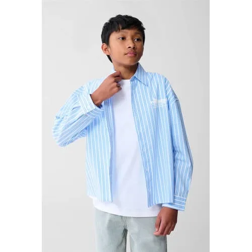 Dit lichtblauwe Shoeby Stripe Artwork overhemd lichtblauw is een frisse basis voor de kledingkast van elke jongen. Het model heeft een relaxed fit, lange mouwen en een klassieke button-down kraag. De combinatie van verticale strepen en tekst-artwork op de achterkant geeft het overhemd een eigentijdse uitstraling, geschikt voor zowel schooldagen als speciale momenten. Gemaakt van 100% katoen voelt de stof zacht aan en is het overhemd prettig voor dagelijks gebruik.Lichtblauwe strepen met stoer artwork Lichtblauw gestreept dessin met backprint en tekst-artwork Relaxed fit voor bewegingsvrijheid en een moderne look Button-down kraag die netjes op zijn plaats blijft Lange mouwen, ideaal voor verschillende seizoenen Gemaakt van 100% katoen voor een zachte en ademende stof Non-stretch kwaliteit voor een verzorgde, vormvaste pasvorm Knoopsluiting aan de voorkant, makkelijk aan en uit te trekken Geen borstzakken voor een rustige en strakke voorkantVoor alledaags én wat netterDit overhemd leent zich goed voor veel situaties. In combinatie met een jeans of chino ontstaat een nette, maar toch ontspannen outfit. Door de relaxed fit voelt het overhemd niet te strak, wat fijn is tijdens school, een familiefeest of een dagje weg.Shoeby voor dagelijks draaggemakShoeby ontwikkelt kleding die past bij het dagelijkse leven van kinderen. De ontwerpen sluiten aan bij actuele trends, maar blijven praktisch en comfortabel. Met aandacht voor pasvormen en materialen biedt Shoeby items die vaak gedragen kunnen worden en makkelijk te combineren zijn.Een lichtblauw overhemd dat klaar is voor drukke dagen, mooie momenten en alles daartussenin.