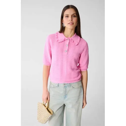 Deze gebreide roze dames polo van Shoeby geeft je dagelijkse outfits een frisse, vrouwelijke uitstraling. De polo heeft een regular fit en korte mouwen die tot op de bovenarm vallen. De polokraag met speelse ruffles en de rij knopen met subtiele strass steentjes zorgen voor een verzorgde, nette look die zowel casual als gekleed gedragen kan worden.Comfortabele knit met verfijnde details Gemaakt van 100% katoen, voelt zacht aan op de huid en is ademend Low-stretch kwaliteit voor een vormvaste pasvorm die mooi aansluit Gebreide ribstructuur voor extra diepte en een moderne uitstraling Polokraag met ruffles en knoopsluiting met strass voor een vrouwelijke touch Effen roze kleur, makkelijk te combineren met je favoriete broeken en rokken Totale lengte van 60 cm bij maat S, fijn bij zowel hoge als normale tailles Wasbaar op 30 graden, handig in het onderhoudIdeaal voor dagelijkse looksDeze polo past goed in je dagelijkse garderobe. Combineer met een hoge jeans voor een relaxte dag, of draag het met een nette pantalon voor een meer geklede outfit. De katoenen knit voelt prettig aan, ook op warmere dagen, waardoor deze polo goed geschikt is voor de zomer.Shoeby stijl in je kastShoeby staat bekend om modieuze items die je gemakkelijk combineert in je bestaande kledingkast. Met deze gebreide polo voeg je een draagbaar kledingstuk toe dat is afgestemd op alledaags gebruik, met oog voor detail en pasvorm.Een knit polo die het hele seizoen goed van pas komt.