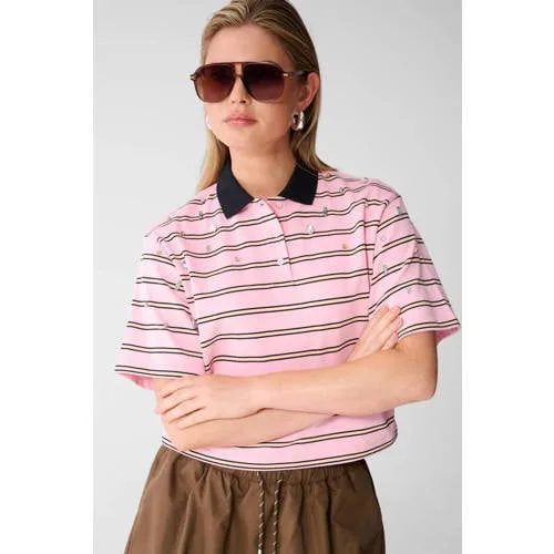 Deze gestreepte dames polo van katoen van Shoeby combineert een sportieve pololook met verfijnde details. De roze, gele en zwarte strepen zorgen voor een frisse uitstraling en door de korte lengte valt het shirt op de taille. De subtiele sierstenen en studs geven een extra accent. Gemaakt van 100% katoen voelt de stof zacht aan op de huid, geschikt voor warme dagen.Details die het verschil maken Kleurcombinatie in roze/geel/zwart met streeppatroon voor een frisse, moderne uitstraling Korte lengte, totale lengte 55 cm bij maat S, goed te dragen op een hoge broek of rok Driekwart mouwen voor een luchtig maar aangekleed effect Polo kraag en geen sluiting, het shirt trek je eenvoudig over het hoofd aan Gemaakt van 100% katoen, een zachte stof die aangenaam aanvoelt op de huid Low-stretch kwaliteit, waardoor de polo zijn vorm goed behoudt Afgewerkt met sierstenen en studs voor extra detail Wasbaar op 30 gradenVoor alledaagse, vrouwelijke looksDit shirt past goed in een dagelijkse garderobe. Combineer het met een hoge jeans en sneakers voor een casual outfit of met een aansluitende rok voor een meer geklede look. De korte lengte maakt het ook geschikt om te dragen boven een broek met wijde pijpen.Shoeby stijlShoeby ontwerpt kleding die goed aansluit op het dagelijks leven. De collecties volgen actuele trends, met aandacht voor pasvorm en draagcomfort. Met deze polo voeg je eenvoudig een shirt met opvallend streeppatroon en subtiele details toe aan je kledingkast.Een zomers shirt met opvallende strepen en verfijnde afwerking.