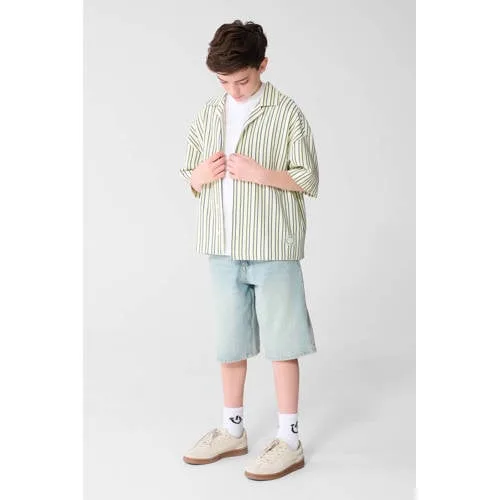 Geef zijn outfit een moderne upgrade met dit pinstripe structuur overhemd voor jongens in gebroken wit. Het overhemd heeft een relaxed fit met korte mouwen en een klassieke reverskraag. De combinatie van structuur in de stof en het streepdessin in ecru, donkerblauw en groen zorgt voor een nette, maar toch speelse uitstraling. De lichte, vormvaste stof met een beetje stretch voelt soepel aan en beweegt gemakkelijk mee, ideaal voor schooldagen en vrije tijd.Details die het verschil maken Gebroken witte basis met pinstripe dessin in donkerblauw en groen Relaxed regular fit, prettig voor schoolkind en tiener Korte mouwen, fijn voor warmere dagen of onder een vest Reverskraag voor een moderne, nette look Doorlopende knoopsluiting, eenvoudig aan en uit te trekken Structuur in de stof voor een extra verzorgde uitstraling Lichte stof met low-stretch voor fijne bewegingsvrijheid Casual overhemd zonder borstzak, rustig en clean ontwerpMakkelijk te stylen voor elke dagDit overhemd past goed bij een jeans of chino voor een dagelijkse look. Voor een iets nettere gelegenheid combineer je het met een donkere broek en sneakers. Open gedragen over een T-shirt werkt het juist weer heel relaxed en stoer.Shoeby: eigentijdse mode voor kidsShoeby staat bekend om trendgerichte collecties die goed passen in het dagelijks leven van kinderen. De ontwerpen zijn afgestemd op wat kids graag dragen en combineren stijl met praktische details. Zo kies je voor kleding waar hij zich de hele dag prettig in kan bewegen.Een frisse, moderne basic die zijn kledingkast makkelijk compleet maakt.
