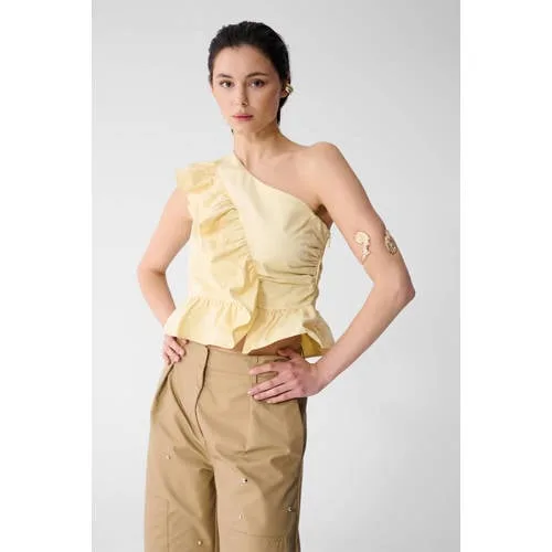 Geef je outfit een moderne upgrade met deze asymmetrische dames top van Shoeby. De Satin Asym Top in lichtgeel heeft een vrouwelijke, getailleerde pasvorm en een mouwloos design, waardoor de schouders mooi uitkomen. De zachte stof met subtiele satijnglans en de asymmetrische belijning zorgen samen voor een verfijnde uitstraling die zowel overdag als tijdens een avond uit goed tot zijn recht komt.Verfijnde details die opvallen One shoulder model met asymmetrische halslijn voor een moderne look Getailleerd bovenstuk en peplum onderkant voor een flatterend silhouet Ruches zorgen voor een speels en vrouwelijk effect Gemaakt van 50% katoen en 10% polyamide met een zachte satijnglans Low-stretch kwaliteit die netjes in model blijft Mouwloos ontwerp, ideaal voor lente en zomer Effen lichtgele kleur die makkelijk te combineren is Totale lengte 52 cm bij maat S Wasbaar op 30 graden voor eenvoudig onderhoudVoor feestelijke en stijlvolle momentenDeze top is een sterke basis voor feestelijke gelegenheden. Combineer met een rechte pantalon voor een moderne, elegante uitstraling of draag hem op een midi-rok voor een meer vrouwelijke look. Ook onder een blazer blijft de asymmetrische halslijn mooi zichtbaar, wat de outfit net wat spannender maakt.Shoeby stijl voor elke dagShoeby staat bekend om eigentijdse collecties die goed passen bij het dagelijkse leven. De Studio-lijn speelt in op actuele trends, maar blijft draagbaar en makkelijk te combineren met items die je al hebt. Met deze top haal je een stijlvol bovenstuk in huis dat je keer op keer kunt dragen.Een elegante keuze voor dagen en avonden waarop je net iets meer verzorgd voor de dag wilt komen.