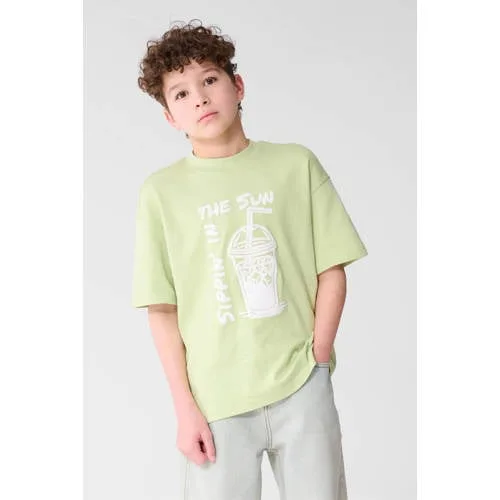 Het Sipping Artwork T-shirt in lichtgroen is een frisse basic met een opvallend detail voor elke dag. Dit lichtgroene T-shirt voor jongens heeft een relaxed fit, korte mouwen en een ronde hals, waardoor het makkelijk over het hoofd gaat en veel bewegingsvrijheid biedt. De zachte stof van 100% katoen voelt soepel aan op de huid en ademt goed, geschikt voor school, speelafspraken of een dagje weg.Frisse kleur en comfortabel model Lichtgroene kleur die goed te combineren is met jeans, jogpants of een korte broek Relaxed fit voor voldoende bewegingsvrijheid tijdens spelen en sporten Korte mouwen en ronde hals voor een luchtig gevoel tijdens het dragen Low-stretch kwaliteit die zorgt voor een stevige vorm en een nette uitstraling Gemaakt van 100% katoen dat zacht aanvoelt en goed ventileert Artwork print op de voorkant als grafisch detail Middel lengte, geschikt om zowel in als over de broek te dragen Wasbaar op 30 graden, praktisch in het dagelijks wassen Geschikt voor peuters, kleuters, schoolkinderen en tienersElke dag een makkelijke outfitDit T-shirt past goed in een moderne garderobe voor kids. Combineer het met een jeans en sneakers voor naar school of met een comfortabele jogpants voor een rustige dag thuis. De lichte kleur en eenvoudige vorm maken het een handig startpunt voor verschillende outfits.Shoeby voor kids met stijlShoeby biedt kinderkleding die aansluit op de nieuwste trends en tegelijk praktisch is in het dagelijks dragen. De collecties voor jongens zijn afgestemd op het actieve leven van kinderen, met aandacht voor pasvorm, materialen en details. Zo krijgt je kind kleding waarin het zich vrij kan bewegen en er netjes uitziet.Een T-shirt in frisse kleur dat makkelijk zijn weg vindt in de dagelijkse outfits.