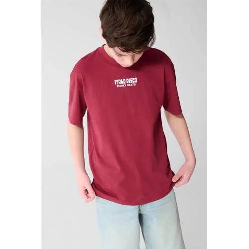 Dit donkerrode jongens T-shirt met tekstprint geeft elke outfit een streetstyle touch. Het shirt heeft een rechtvallende pasvorm, korte mouwen en een ronde hals. De gladde structuur en de opvallende tekstprint, met ook een backprint, zorgen voor een moderne look die goed past bij de huidige collectie. De enkele knopen bij de hals voegen een speels detail toe en maken het T-shirt net even anders.Details die opvallen in het dagelijks leven Gemaakt van 100% katoen voor een zachte touch op de huid Low-stretch kwaliteit, voelt stevig aan en blijft mooi in model Rechtvallende fit voor peuter, kleuter, schoolkind en tiener Opvallende tekstprint met backprint voor een eigentijdse uitstraling Ronde hals met enkele knopen voor een speels accent Middellange lengte, makkelijk te combineren met jeans of shorts Wasbaar op 30 graden, praktisch voor dagelijks gebruikMakkelijk te stylen voor elke dagDit T-shirt past goed bij een denim short in de zomer of een donkere jeans op koelere dagen. Sneakers eronder en je kind is klaar voor school, een speelafspraak of een dagje weg. De stevige, low-stretch stof geeft lichte bewegingsvrijheid en voelt betrouwbaar aan tijdens actief spelen.Shoeby als vertrouwde keuzeShoeby staat voor eigentijdse kindermode met aandacht voor draagbaarheid en stijl. De collecties sluiten aan bij de laatste trends, maar blijven praktisch voor het dagelijkse leven met kinderen. Met dit T-shirt haal je een kledingstuk in huis dat comfortabel draagt, er modern uitziet en gemakkelijk in de was gaat.Een praktische basic met karakter voor de kleerkast van jouw kind.