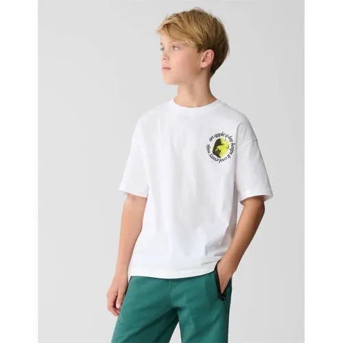 Voor school, speelafspraken of een dag in de stad, met het Apple Artwork T-shirt Wit heeft jouw kind altijd een frisse en stoere basic in de kast. Het jongens T-shirt heeft een regular fit, korte mouwen en een ronde hals, waardoor het makkelijk over het hoofd gaat en prettig valt. De opvallende tekst en artworkprint geven de witte basis een grafische look die direct opvalt, ook dankzij de backprint.Details waar kids blij van worden Gemaakt van 100% katoen dat zacht aanvoelt op de huid Regular fit voor voldoende bewegingsruimte tijdens het spelen Korte mouwen en ronde hals, ideaal voor elke dag Backprint met opvallende tekst en artwork voor een moderne look Low-stretch materiaal voor een vormvaste pasvorm Wasbaar op 30 graden, handig in het dagelijkse wasritmeElke dag klaar voor actieDit T-shirt past net zo makkelijk bij een jogger als bij een jeans. De witte kleur combineert eenvoudig met sportieve sneakers of een vest. Door de low-stretch kwaliteit blijft de pasvorm mooi, ook als het T-shirt vaak gedragen en gewassen wordt.Shoeby voor moderne kidsShoeby ontwerpt kinderkleding met een eigentijdse uitstraling en praktische details. De collecties sluiten aan bij wat kinderen fijn vinden om te dragen en wat ouders handig vinden in gebruik. Zo krijgt jouw kind een T-shirt dat er goed uitziet en prettig zit, elke dag opnieuw.Een stoer basisitem dat moeiteloos meeloopt met het drukke leven van je kind.