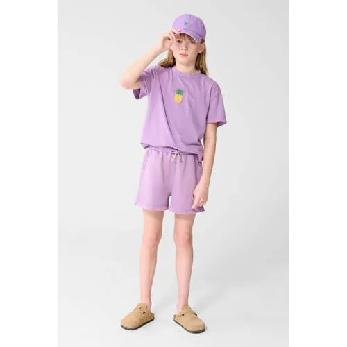 Een vrolijke update voor de kast van je dochter: dit paarse meisjes T-shirt van katoen is een fijne basic met een speelse printopdruk. De rechte pasvorm en middel-lange lengte zorgen voor een ontspannen look, terwijl de ronde hals en korte, rechte mouwen het T-shirt makkelijk combineerbaar maken met jeans, rok of short. Ideaal voor schooldagen, speelafspraken en vrije tijd.Fijne details voor elke dag Gemaakt van 100% katoen, voelt zacht en prettig aan op de huid Paarse kleur uit de trendy kindercollectie van Shoeby Printopdruk aan de voorkant voor een speels accent Rechtvallende pasvorm, comfortabel om in te bewegen Middel-lange lengte, valt mooi op een broek of rok Korte, rechte mouwen passend bij allerlei seizoenen Ronde hals die makkelijk over het hoofd gaat Low-stretch materiaal dat vormvast blijft Wasbaar op 30 graden, praktisch in het dagelijks onderhoudVoor peuter, kleuter, schoolkind en tienerDit T-shirt is beschikbaar voor verschillende leeftijden en past goed in een trendy kindergarderobe. Draag het op een jeans met sneakers voor een casual look of combineer met een rok voor een meer girly outfit. Door de rechte pasvorm is er genoeg ruimte om te rennen, spelen en ontdekken.Shoeby als vertrouwde keuzeShoeby staat bekend om eigentijdse kindermode met een duidelijke stijl en een comfortabele pasvorm. De collecties sluiten aan bij de laatste trends en zijn ontworpen voor het dagelijkse leven van kinderen, met oog voor draaggemak en kwaliteit.Een kleurrijk T-shirt waar je kind graag naar grijpt op drukke schooldagen en ontspannen momenten thuis.