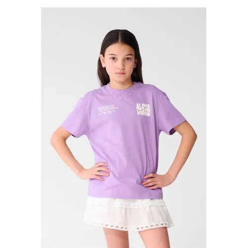 Voor elke speelse dag is dit paarse meisjes T-shirt van katoen een praktische basic voor elke dag. Het shirt heeft een frisse paarse kleur en een opvallende tekstprint op de voorzijde. De ronde hals en korte mouwen geven een luchtig gevoel, terwijl de rechte pasvorm prettig zit zonder te strak te zijn. Gemaakt van 100 procent katoen, voelt de stof zacht aan en is het T-shirt geschikt voor dagelijks dragen naar school, sport of een middag spelen.Praktische details voor elke dag Gemaakt van 100 procent katoen voor een zachte touch op de huid Low-stretch materiaal voor een vormvast model dat netjes blijft Korte, rechte mouwen voor een comfortabele pasvorm Ronde hals die makkelijk over het hoofd gaat Middellange lengte die mooi valt op een broek of rok Tekstprint aan de voorkant voor een stoere uitstraling Wasbaar op 30 graden, handig in het drukke wasritmeComfortabel bij broek, rok of shortDit paarse T-shirt laat zich makkelijk combineren met een jeans, legging of short. Draag het los over de broek of licht ingestopt in de taille voor een strakkere look. Ideaal voor schooldagen, speelafspraken en vrije tijd.Shoeby voor kinderenShoeby staat bekend om kinderkleding met een eigentijdse stijl en draagbare pasvormen. De collecties sluiten aan op de laatste trends, maar zijn altijd gemaakt met het oog op dagelijks gemak en comfort. Zo voelt je kind zich vrij om te bewegen en te spelen.Een kleurrijk T-shirt dat favoriete outfits net wat meer karakter geeft.