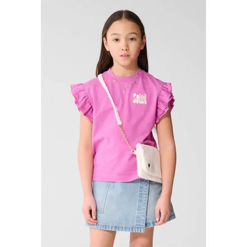 Geef haar outfit meteen een speels accent met dit roze meisjes T-shirt met ruffle mouwen van Shoeby. De zachte kleur en vrolijke tekstprint zorgen voor een frisse look, terwijl de ruches op de mouwen het shirt net even anders maken. Door de rechtvallende pasvorm met ronde hals zit het T-shirt comfortabel en blijft het mooi in model tijdens spelen, rennen en chillen.Frisse details voor elke dag Roze T-shirt met opvallende tekstprint aan de voorkant Ruffle kapmouwen voor een speelse uitstraling Gemaakt van 100% katoen, voelt zacht aan op de huid Low-stretch stof, behoudt goed de vorm tijdens het dragen Rechtvallende fit met ronde hals, makkelijk te combineren Geschikt voor peuter, kleuter, schoolkind en tiener Geen zakken, waardoor het shirt mooi glad valtMakkelijk combineren in haar kledingkastDit T-shirt past net zo goed op een stoere jeans als op een zwierige rok of korte broek. Handig voor schooldagen, speelafspraken of een dagje weg. De frisse roze kleur en de ruches maken het een opvallend bovenstuk in haar kast.Shoeby: moderne stijl voor kidsShoeby staat voor eigentijdse kindermode met oog voor detail en pasvorm. De collecties sluiten aan bij wat kinderen graag dragen en wat ouders praktisch vinden. Met dit T-shirt kies je voor een item dat goed aansluit bij dagelijkse outfits.Een T-shirt waarin zij zich de hele dag vrij kan bewegen.