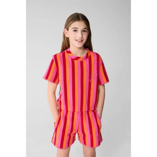 Geef haar outfit meteen kleur met dit gestreepte T-shirt voor meisjes van Shoeby. De oranje, roze en rode strepen zorgen voor een frisse, speelse look die opvalt zonder te druk te zijn. De rechte pasvorm valt comfortabel, terwijl de korte mouwen en ronde hals het shirt ideaal maken voor alledaags gebruik, van schooldag tot speelafspraak.Vrolijke details voor elke dag Gestreept dessin in roze, rood en oranje voor een kleurrijke uitstraling Gemaakt van 100% katoen, wat zacht aanvoelt op de huid Lichte stretch voor bewegingsvrijheid tijdens spelen en rennen Regular fit met middellange lengte, makkelijk te combineren met jeans of rok Korte, rechte mouwen en ronde hals voor een tijdloze basis Elastische band aan de onderkant voor een nette, aangesloten look Subtiele textuur en kleine logo details voor een verzorgde afwerking Geschikt voor peuters, kleuters, schoolkinderen en tieners Wasbaar op 30 graden, handig in het dagelijks wasritmeKleur in haar dagelijkse outfitsDit T-shirt past gemakkelijk in haar bestaande garderobe. Draag het met een short op warme dagen of onder een vest als het wat frisser is. De gestreepte print maakt zelfs een simpele jeans direct wat vrolijker.Shoeby voor trendy kidsShoeby ontwerpt kleding die aansluit bij het dagelijkse leven van kinderen, met aandacht voor draagcomfort en een trendy uitstraling. Met dit T-shirt haal je een eigentijds item in huis dat goed past bij de rest van de Shoeby kinderkledingcollectie.Een speelse basic voor drukke, actieve dagen.