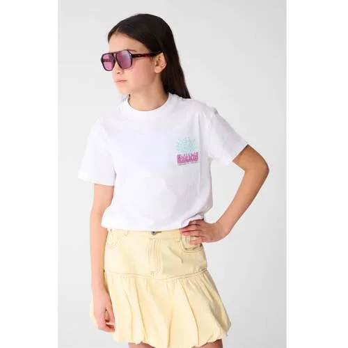 Dit witte meisjes T-shirt van katoen is een fijne basic voor elke dag. Het shirt heeft een rechtvallende pasvorm, korte mouwen en een ronde hals die prettig aansluit zonder te knellen. De zachte stof met lichte stretch beweegt makkelijk mee, zodat kinderen vrij kunnen spelen, rennen en ontdekken. Door het speelse artwork op de voorkant krijgt het T-shirt een opvallende uitstraling die direct in het oog springt.Praktische details voor elke dag Gemaakt van 100% katoen, voelt zacht en luchtig aan op de huid Low stretch materiaal met een beetje rek voor extra draagcomfort Rechtvallende pasvorm, ideaal voor peuters, kleuters, schoolkinderen en tieners Korte, rechte mouwen en middel lengte, fijn voor alle seizoenen Ronde hals voor een comfortabele en bekende fit Printopdruk met speels artwork aan de voorzijde Wasbaar op 30 graden, eenvoudig te onderhouden Los item, geen co-ord set, dus makkelijk te combineren met bestaande kledingStyling voor speelse dagenDit T-shirt past net zo makkelijk op een korte broek als op een jeans of rok. In de zomer draag je het zo, op koelere dagen schuif je er simpel een vest of hoodie overheen. Door de witte kleur combineert het shirt goed met felle kleuren en rustige basics.Shoeby voor modebewuste kidsShoeby staat bekend om kinderkleding die trends volgt en tegelijk praktisch blijft in het dagelijks leven. De collecties voor meiden zitten vol eigentijdse prints en draagbare modellen, zodat kinderen zich fijn voelen in wat ze dragen.Een fris, comfortabel T-shirt dat goed past in de kindergarderobe.