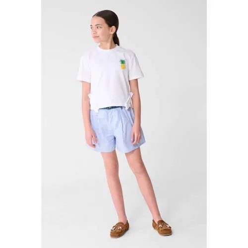 Voor een frisse, speelse look is dit wit meisjes T-shirt met ananas artwork een praktische basis in de kledingkast. Het T-shirt heeft een regular fit en korte mouwen, waardoor het comfortabel zit en makkelijk te combineren is. De gladde structuur van de stof en de ronde hals geven een rustige, nette uitstraling, terwijl het ananas artwork zorgt voor een opvallend detail voor elke dag.Speels model met verstelbare onderkant Gemaakt van 100% katoen, zacht en ademend voor een prettig gevoel op de huid Low-stretch materiaal dat mooi in vorm blijft tijdens het dragen Korte lengte met aansnoerkoord aan de onderzijde voor een verstelbare pasvorm Ronde hals en rechte mouwen voor een tijdloze, makkelijk draagbare stijl Effen witte kleur met ananas artwork en subtiele details zoals borduursels en ruches Zonder zakken voor een rustige, cleane look Wasbaar op 30 graden, praktisch voor dagelijks gebruikVoor schooldagen, weekend en vakantieDit T-shirt past goed bij een korte denim, een luchtige rok of een comfortabele jogger. Geschikt voor peuter, kleuter, schoolkind en tiener, en daardoor passend voor naar school, een logeerpartij of een dagje weg.Shoeby: eigentijdse kidscollectieShoeby staat bekend om kinderkleding met een eigentijdse uitstraling en doordachte details. De collecties sluiten aan bij de laatste trends en zijn ontworpen om makkelijk te combineren te zijn, zodat er steeds weer nieuwe outfits ontstaan met een paar favoriete items.Een luchtig T-shirt dat geschikt is voor elke dag.